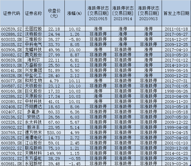 受化工品不斷漲價(jià)的影響,資本聞風(fēng)而動(dòng),增加了化工品相關(guān)期貨市場(chǎng)的波動(dòng),同時(shí)在證券市場(chǎng),資金也對(duì)部分業(yè)績(jī)?cè)鲩L(zhǎng)及細(xì)分化工品龍頭企業(yè)進(jìn)行布局,推進(jìn)上市公司股價(jià)創(chuàng)新高。截至9月15日,除新股外,27只化工股股價(jià)創(chuàng)歷史新高,不僅如此,清水源、雙一科技、江天化學(xué)、和邦生物等26只個(gè)股以漲停價(jià)報(bào)收,而批量漲停情況也不止是今天,9月13日、9月14日化工股均出現(xiàn)批量漲停,單日漲停股個(gè)股分別達(dá)到33只、16只。