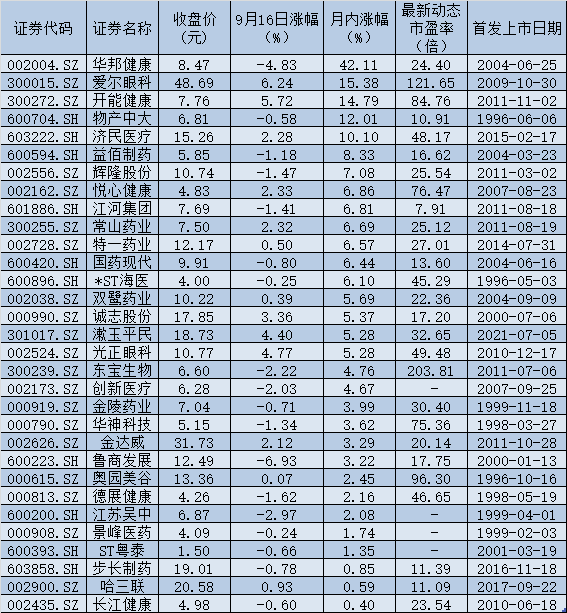 在9月份以來(lái)的這波反彈中,醫(yī)美股的分化趨勢(shì)已有所體現(xiàn),期間有31只醫(yī)美概念股呈現(xiàn)不同程度的上漲,占行業(yè)內(nèi)成份股比例為60.78%,華邦健康、愛(ài)爾眼科、開(kāi)能健康、物產(chǎn)中大、濟(jì)民醫(yī)療等個(gè)股期間累計(jì)漲幅均在10%以上。反觀出現(xiàn)下跌的個(gè)股,超半數(shù)最新動(dòng)態(tài)市盈率在50倍以上,國(guó)際醫(yī)學(xué)、愛(ài)美客、貝泰妮、華熙生物等4只個(gè)股最新動(dòng)態(tài)市盈率均高于100倍。
