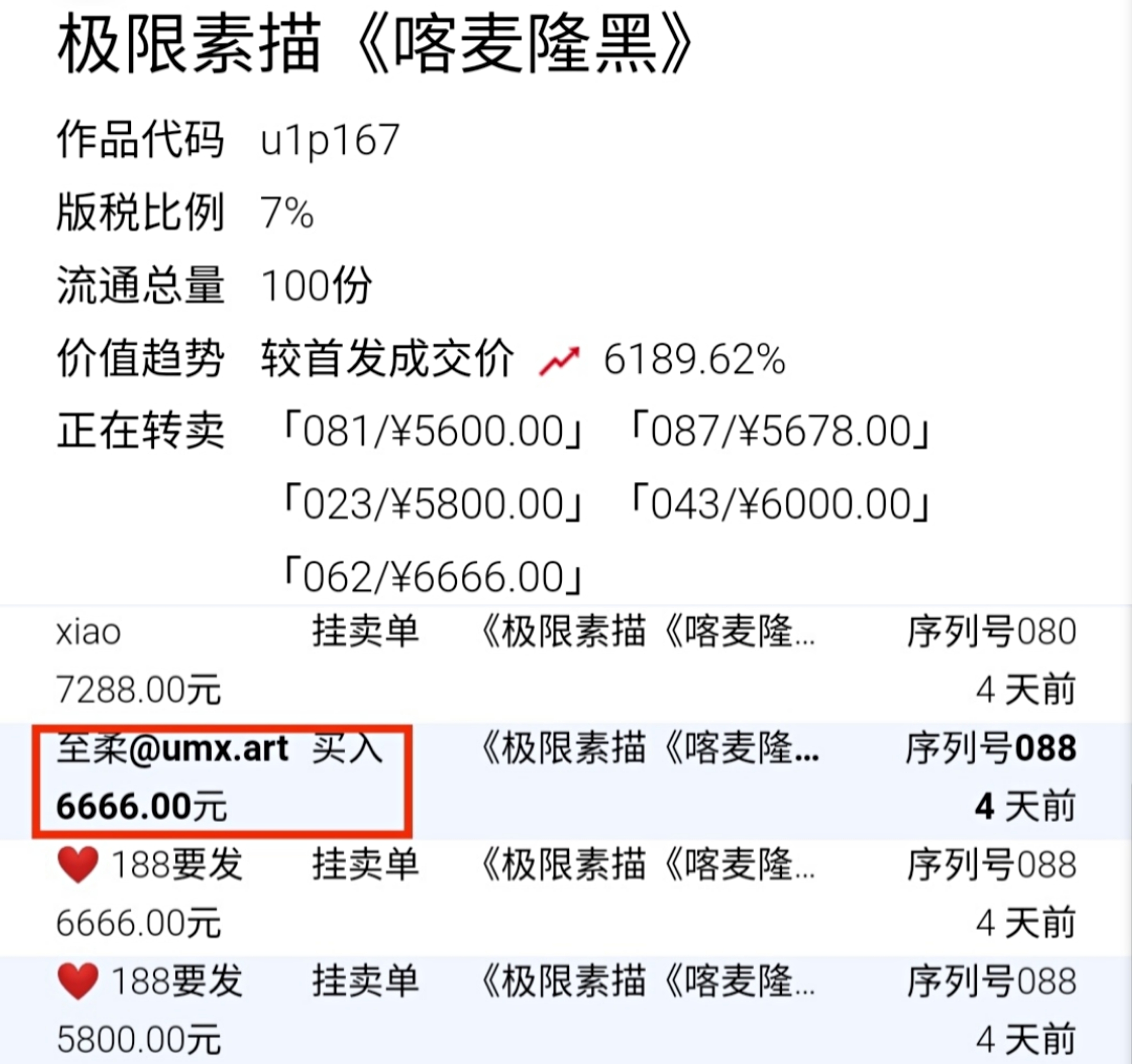 在UMX平臺(tái)二手市場(chǎng),記者注意到首發(fā)價(jià)格36元發(fā)行100份的“極限素描《喀麥隆黑》”NFT商品,目前二手掛售價(jià)格已經(jīng)在5000元以上,較首發(fā)成交價(jià)漲超6000%,最近一筆成交價(jià)格更是高達(dá)6666元。