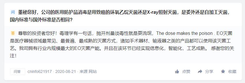 事實上,早在去年防疫物資大規(guī)模生產(chǎn)的時候,就有用戶向口罩生產(chǎn)商提出過類似問題:防護品消毒是用環(huán)氧乙烷滅菌還是X-ray照射滅菌?當時,一家上市公司的答復也很幽默:“毒理學有一句話,拋開劑量談毒性就是耍流氓,EO(環(huán)氧乙烷)滅菌是醫(yī)療器械領(lǐng)域最常見、最普遍、最成熟的滅菌方式,諸如手術(shù)器材、輸液器之類的產(chǎn)品都可以使用該滅菌工藝。”