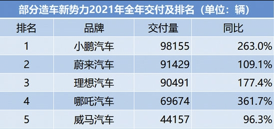 蔚來汽車方面,2021年共交付91429輛汽車,同比增長109.1%。截至2021年12月31日,ES8、ES6和EC6的累計交付量已達(dá)到167070輛;理想汽車方面,2021年的總交付90491輛汽車,同比增長177.4%。在2021年12月交付了14087輛汽車,同比增長130%。