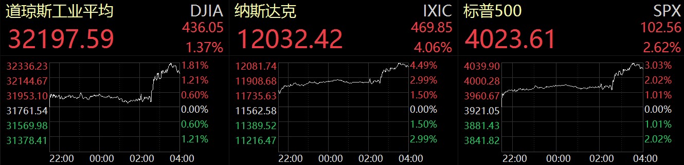 市場分析人士普遍認為本次加息符合市場預(yù)期。受到消息面影響,當?shù)貢r間7月27日,美股三大指數(shù)集體收漲,其中,道瓊斯指數(shù)漲1.37%,報32197.59點;標普500指數(shù)漲2.62%,報4023.61點;納斯達克指數(shù)漲4.06%,報12032.42點,創(chuàng)2020年4月份以來最大單日漲幅。