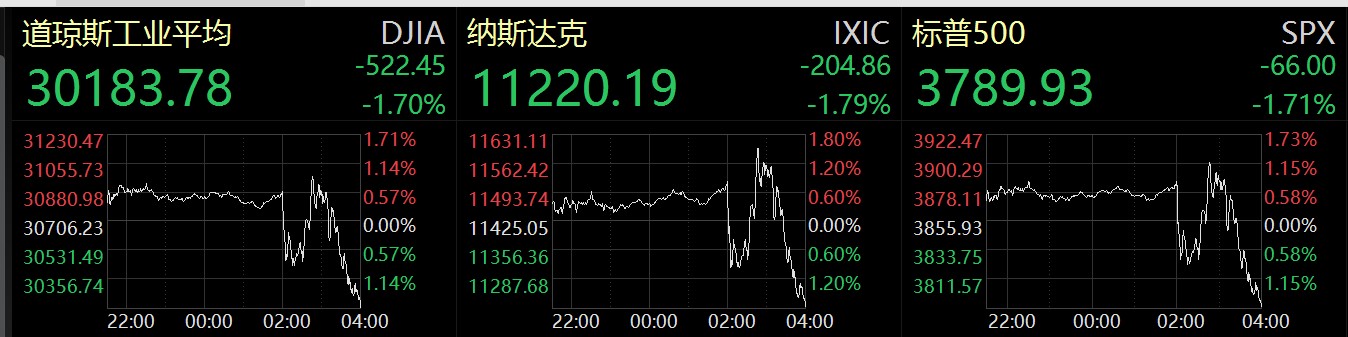 受此影響,當(dāng)日,美股三大指數(shù)集體跌逾1%,道瓊斯指數(shù)跌1.7%,下跌逾500點(diǎn),報(bào)30183.78點(diǎn);標(biāo)普500指數(shù)跌1.71%,報(bào)3789.93點(diǎn);納斯達(dá)克指數(shù)跌1.79%,報(bào)11220.19點(diǎn)。