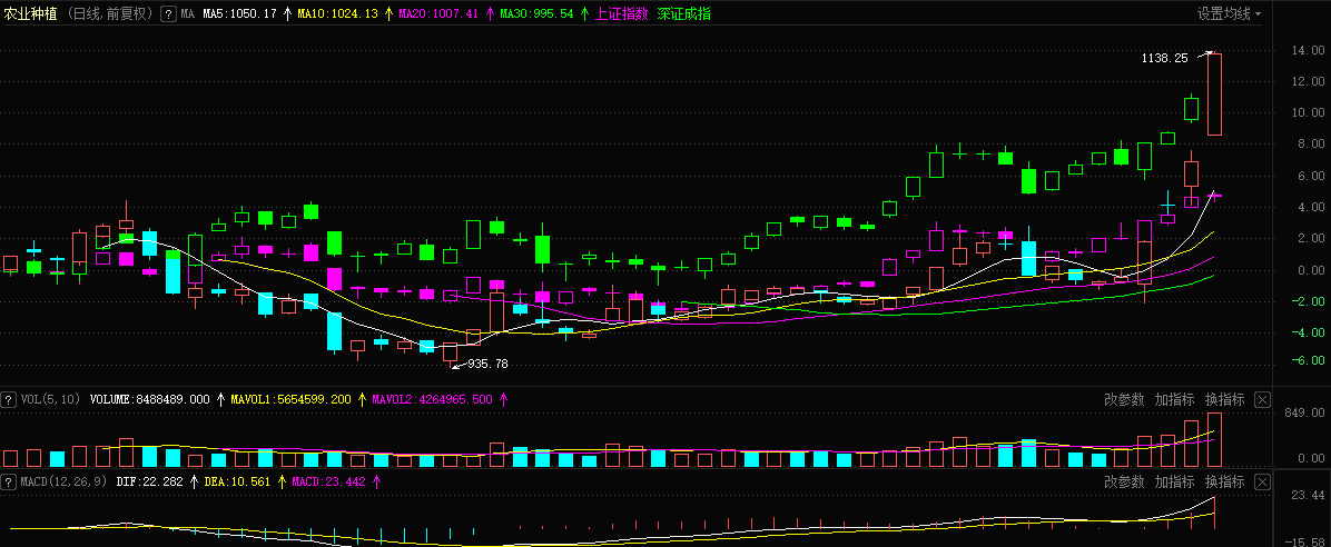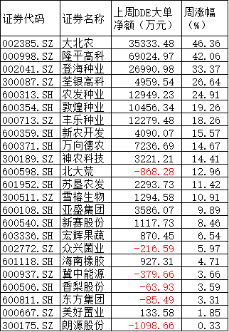 大量資金推動了農(nóng)業(yè)種植板塊的上漲,數(shù)據(jù)顯示,本周板塊內(nèi)23只個股合計大單凈額流入高達19.41億元,其中17只個股凈流入,流入額最高的是隆平高科,達到6.90億元,大北農(nóng)、登海種業(yè)、農(nóng)發(fā)種業(yè)、豐樂種業(yè)、敦煌種業(yè)緊隨其后,周大單凈額均超過1億元。如此大的資金必然激起板塊內(nèi)個股的大漲,其中,大北農(nóng)本周的4個交易日內(nèi)連續(xù)漲停,周漲幅高達46.36%,隆平高科、登海種業(yè)、荃銀高科、農(nóng)發(fā)種業(yè)、敦煌種業(yè)、豐樂種業(yè)、新農(nóng)開發(fā)、萬向德農(nóng)、神農(nóng)科技、北大荒、蘇墾農(nóng)發(fā)、雪榕生物等12只個股周漲幅也均超過10%。