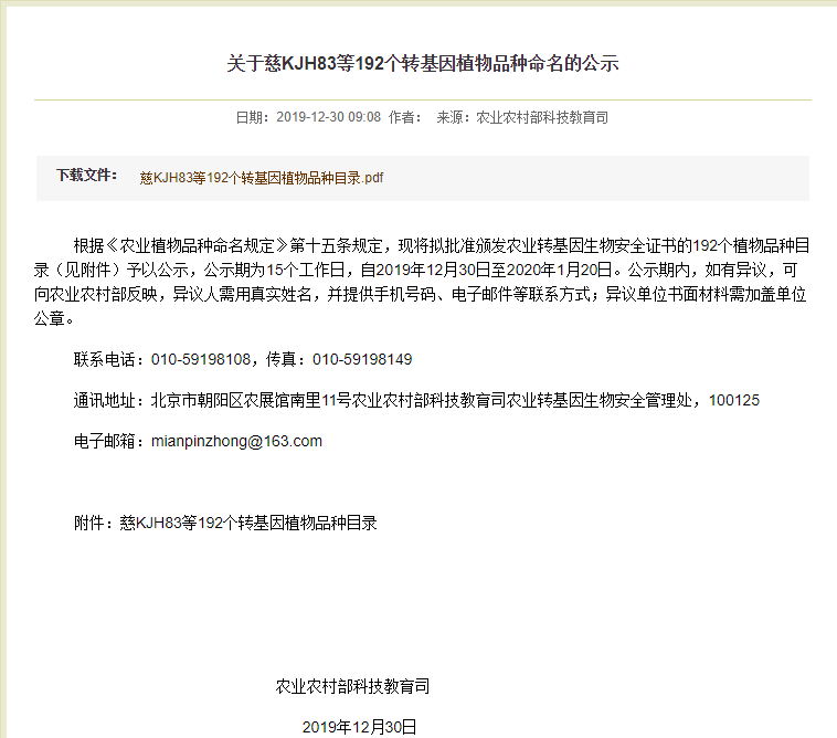 此外,在2019年12月30日,農(nóng)業(yè)農(nóng)村部科技教育司發(fā)布《關(guān)于慈KJH83等192個轉(zhuǎn)基因植物品種命名的公示》,擬批準(zhǔn)為192個植物品種目錄頒發(fā)農(nóng)業(yè)轉(zhuǎn)基因生物安全證書,公示期為15個工作日,自2019年12月30日至2020年1月20日。