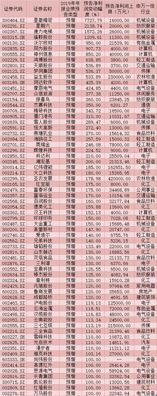 進(jìn)一步統(tǒng)計(jì)發(fā)現(xiàn),上述311家年報(bào)預(yù)喜公司中,除年報(bào)業(yè)績(jī)預(yù)計(jì)扭虧公司外,預(yù)計(jì)年報(bào)凈利潤(rùn)同比增長(zhǎng)超過(guò)100%的公司有67家,星徽精密、星期六、康力電梯、福鞍股份等4家公司均預(yù)計(jì)2019年全年凈利潤(rùn)同比增長(zhǎng)超過(guò)10倍,分別達(dá)到7727.79%、2138.74%、1572.26%、1209.61%,沃爾核材(950.00%)、同為股份(907.73%)、神州信息(850.20%)、鴻博股份(638.85%)、天順股份(536.89%)、夢(mèng)網(wǎng)集團(tuán)(536.37%)和益生股份(533.89%)等公司2019年全年凈利潤(rùn)也均有望同比增長(zhǎng)5倍以上。
