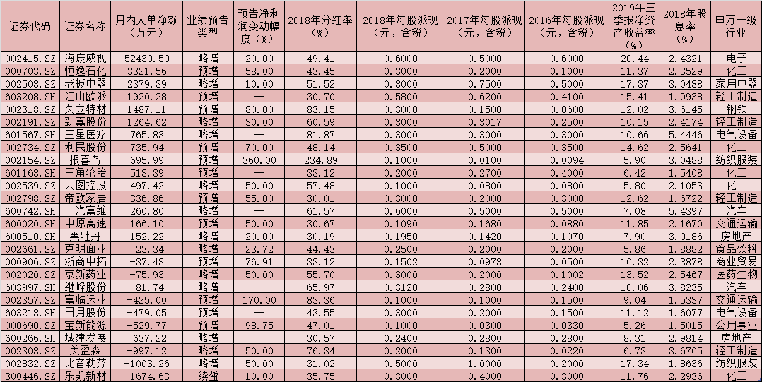 對(duì)于高分紅標(biāo)的篩選,分析人士建議從現(xiàn)金分紅、基本面等兩大角度進(jìn)行篩選,構(gòu)建高股息組合?,F(xiàn)金分紅:股息率高于1.5%、2016年以來(lái)連續(xù)分紅且2018年分紅率高于30%?;久妫?019年前三季度凈資產(chǎn)收益率超過(guò)5%且2019年全年業(yè)績(jī)預(yù)喜。根據(jù)上述條件進(jìn)行梳理共有26只年報(bào)預(yù)喜股具有高分紅潛力,這些公司包括三星醫(yī)療、一汽富維、繼峰股份、城建發(fā)展、江山歐派、日月股份等。