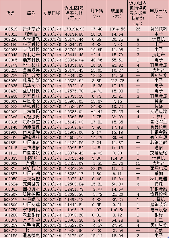 《證券日?qǐng)?bào)》記者根據(jù)同花順數(shù)據(jù)統(tǒng)計(jì)發(fā)現(xiàn),1月2日至1月6日的3個(gè)交易日里,滬深兩市共有1077只兩融標(biāo)的股實(shí)現(xiàn)融資凈買入,其中累計(jì)融資凈買入額超1億元的兩融標(biāo)的股達(dá)到41只,貴州茅臺(tái)(17.02億元)、深科技(4.31億元)、科大訊飛(3.62億元)、華天科技(3.50億元)、長(zhǎng)信科技(3.27億元)、保利地產(chǎn)(3.04億元)、晶方科技(2.33億元)、華友鈷業(yè)(2.14億元)和魯商發(fā)展(2.02億元)等9只個(gè)股期間累計(jì)融資凈買入額均達(dá)到2億元以上。另外,包括遼寧成大、兆易創(chuàng)新、風(fēng)華高科、藍(lán)思科技、天齊鋰業(yè)、中國(guó)寶安等在內(nèi)的32只個(gè)股期間累計(jì)融資凈買入額均達(dá)到或超過(guò)1億元,上述41只個(gè)股合計(jì)融資凈買入額達(dá)到86.53億元。