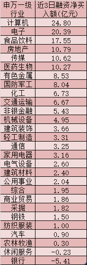 行業(yè)特征方面,在1月2日至1月6日期間,26個(gè)申萬(wàn)一級(jí)行業(yè)期間實(shí)現(xiàn)融資凈買入,其中,計(jì)算機(jī)、電子、食品飲料、房地產(chǎn)、傳媒、醫(yī)藥生物等六行業(yè)期間融資凈買入額居前,均超10億元,分別為:24.80億元、20.39億元、17.55億元、10.79億元、10.62億元和10.27億元。
