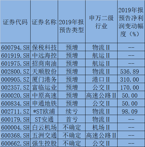 事實(shí)上,受到春節(jié)效應(yīng)的影響,交通運(yùn)輸產(chǎn)業(yè)相關(guān)公司的業(yè)績(jī)正在改善。從已披露年報(bào)預(yù)告的13家公司來(lái)看,共有8家公司2019年業(yè)績(jī)表現(xiàn)預(yù)喜。報(bào)告期內(nèi),天順股份(536.89%)、廈門(mén)港務(wù)(310.00%)、富臨運(yùn)業(yè)(170.00%)等3家公司預(yù)計(jì)凈利潤(rùn)實(shí)現(xiàn)同比翻番。*ST歐浦(98.09%)、中原高速(50.00%)、申通地鐵(50.00%)等3家公司年報(bào)凈利潤(rùn)有望實(shí)現(xiàn)同比增長(zhǎng)50%及以上。