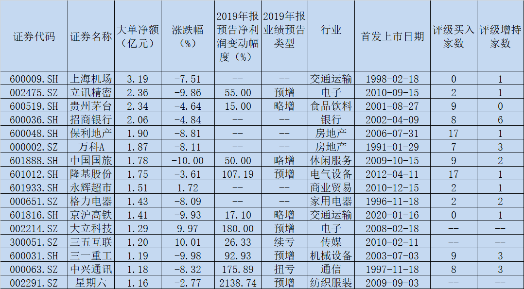 值得關(guān)注的是,仍有部分標(biāo)的周一獲得大單資金的逆市流入。《證券日報》記者根據(jù)同花順數(shù)據(jù)統(tǒng)計發(fā)現(xiàn),滬深兩市共有191只個股受到1000萬元以上大單資金青睞。其中,上海機場(3.19億元)、立訊精密(2.36億元)、貴州茅臺(2.34億元)、招商銀行(2.06億元)、保利地產(chǎn)(1.90億元)、萬科A(1.87億元)、中國國旅(1.78億元)、隆基股份(1.75億元)、永輝超市(1.51億元)、格力電器(1.43億元)、京滬高鐵(1.41億元)、大立科技(1.29億元)、三五互聯(lián)(1.20億元)、三一重工(1.19億元)、中興通訊(1.18億元)、星期六(1.16億元)等16只個股大單資金凈流入超過1億元,合計凈流入金額27.62億元。