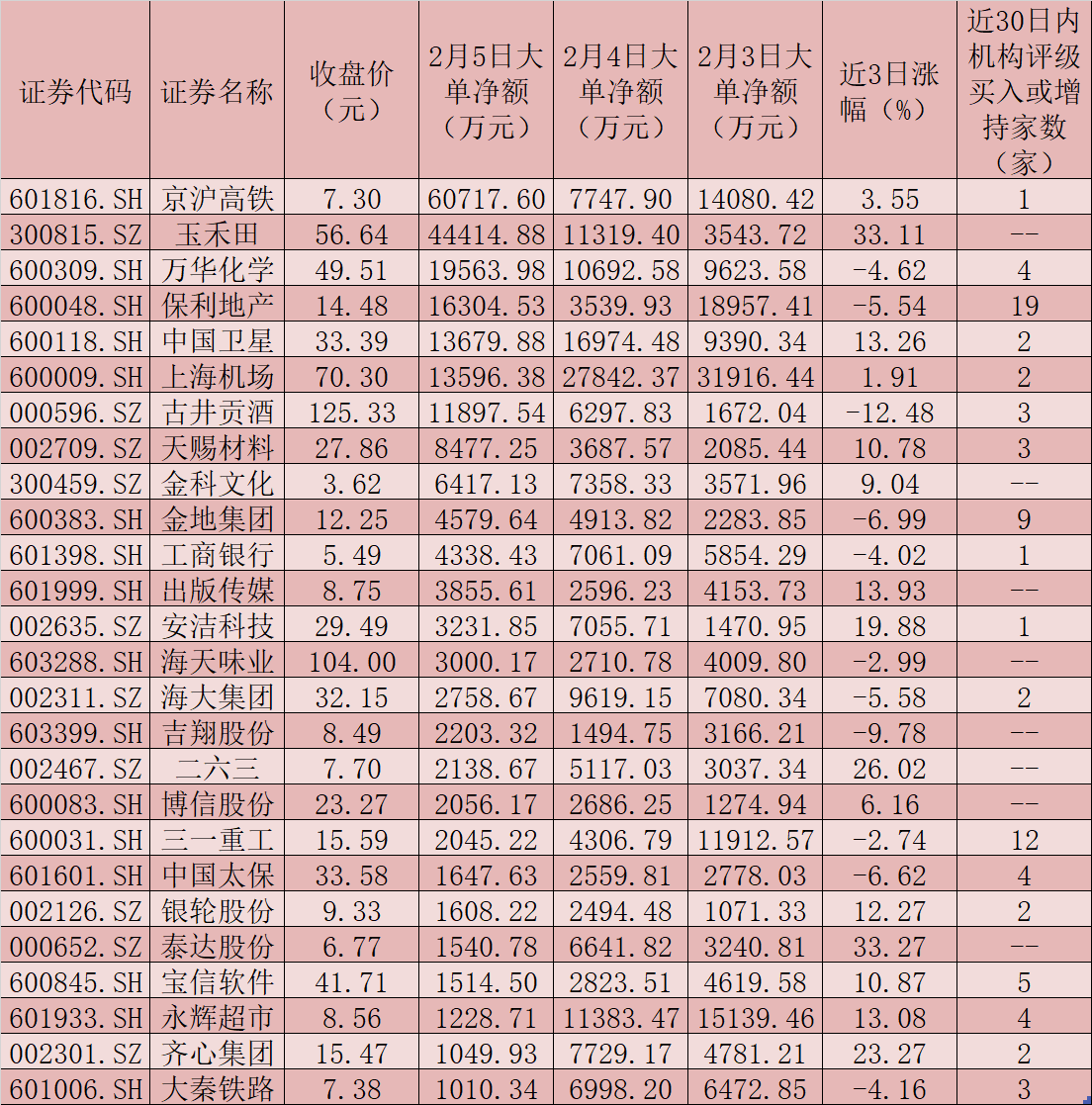 進一步統(tǒng)計發(fā)現(xiàn),有25只個股近3日累計大單資金凈流入超過1億元,京滬高鐵、上海機場、玉禾田、中國衛(wèi)星、萬華化學、保利地產(chǎn)、永輝超市等7只個股近3日均受到2億元以上大單資金搶籌,包括古井貢酒、海大集團、三一重工、金科文化、工商銀行、大秦鐵路、天賜材料等在內的18只個股期間累計大單資金凈流入也均超過1億元。