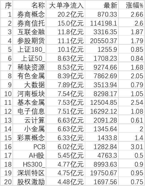 從大單資金流向來看,有72類板塊呈現(xiàn)大單資金凈流入,占比21.43%,券商概念(20.2億元)、券商信托(15.0億元)、互聯(lián)金融(11.8億元)等板塊位居前3;有264類板塊大單資金流出,融資融券(-44.7億元)、深股通(-36.3億元)、深成500(-30.9億元)居前3位。
