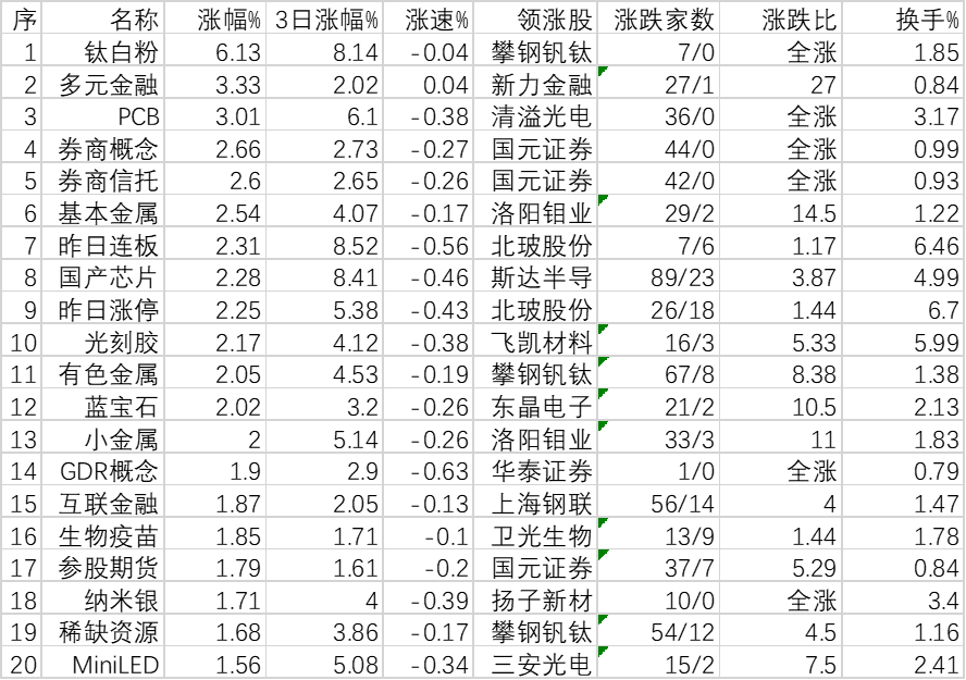 從板塊走勢來看,截至上午收盤,有285類板塊上漲,占比84.82%,鈦白粉(6.13%)、多元金融(3.33%)、PCB(3.01%)等板塊居前3位;有49類板塊下跌,口罩(-2.49%)、草甘膦(-2.16%)、農(nóng)業(yè)種植(-1.49%)等板塊居前3位。