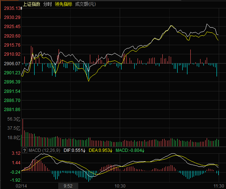2月14日,滬深兩市略低開后拉鋸震蕩并不斷走高,在上午收盤前8分鐘三大指數(shù)出現(xiàn)回落趨勢。截至上午收盤,個股方面漲多跌少,有2273只個股上漲,占交易中個股總數(shù)的60.23%,下跌股1240只。截至早盤收盤上證綜指報(bào)2921.25點(diǎn),上漲0.52%;深證成指報(bào)10949.68點(diǎn),上漲0.79%;創(chuàng)業(yè)板指報(bào)2084.84點(diǎn),漲幅達(dá)0.98%。
