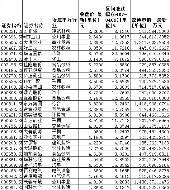 統(tǒng)計(jì)發(fā)現(xiàn),截至4月9日,整個(gè)A股最新均價(jià)為17.3元。上述226只個(gè)股中,有143只個(gè)股最新收盤(pán)價(jià)低于這一數(shù)值,占比逾六成。其中,包括大康農(nóng)業(yè)、好當(dāng)家、華誼嘉信、金正大、佳隆股份等在內(nèi)的29只個(gè)股最新收盤(pán)價(jià)均不足5元。