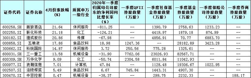 進(jìn)一步統(tǒng)計(jì)發(fā)現(xiàn),券商推薦的5月份“金股”中,有42只金股在4月份已經(jīng)率先實(shí)現(xiàn)上漲,其中,北方華創(chuàng)、上海家化、天康生物、晶澳科技、中航高科、首旅酒店、聯(lián)化科技、深信服、捷成股份、中新賽克、中際旭創(chuàng)等11只個(gè)股4月份累計(jì)漲幅均在20%以上,與之形成鮮明對(duì)比的則是,圣農(nóng)發(fā)展、光迅科技、永輝超市、口子窖等4只個(gè)股期間股價(jià)均出現(xiàn)不同程度的下跌。