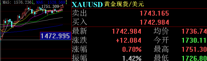 1751.309美元/盎司!近期國際現(xiàn)貨黃金價(jià)格盤中創(chuàng)下8年新高。