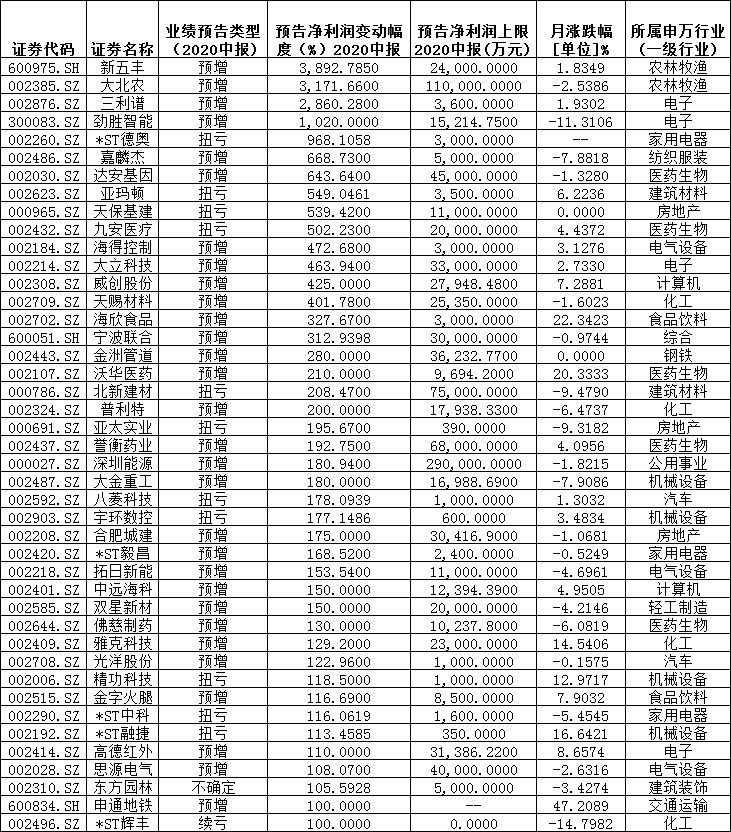 進(jìn)一步梳理可見,在已發(fā)布中報(bào)業(yè)績(jī)預(yù)告的公司中,有43家公司凈利潤(rùn)同比有望實(shí)現(xiàn)翻番。其中,新五豐、大北農(nóng)、三利譜和勁勝智能等4家公司預(yù)計(jì)今年上半年凈利潤(rùn)增幅上限在10倍以上,分別為3892.785%、3171.66%、2860.28%和1020%。緊隨其后的是*ST德奧、嘉麟杰、達(dá)安基因、亞瑪頓、天?;ê途虐册t(yī)療等6家公司,凈利潤(rùn)同比增幅均超500%。