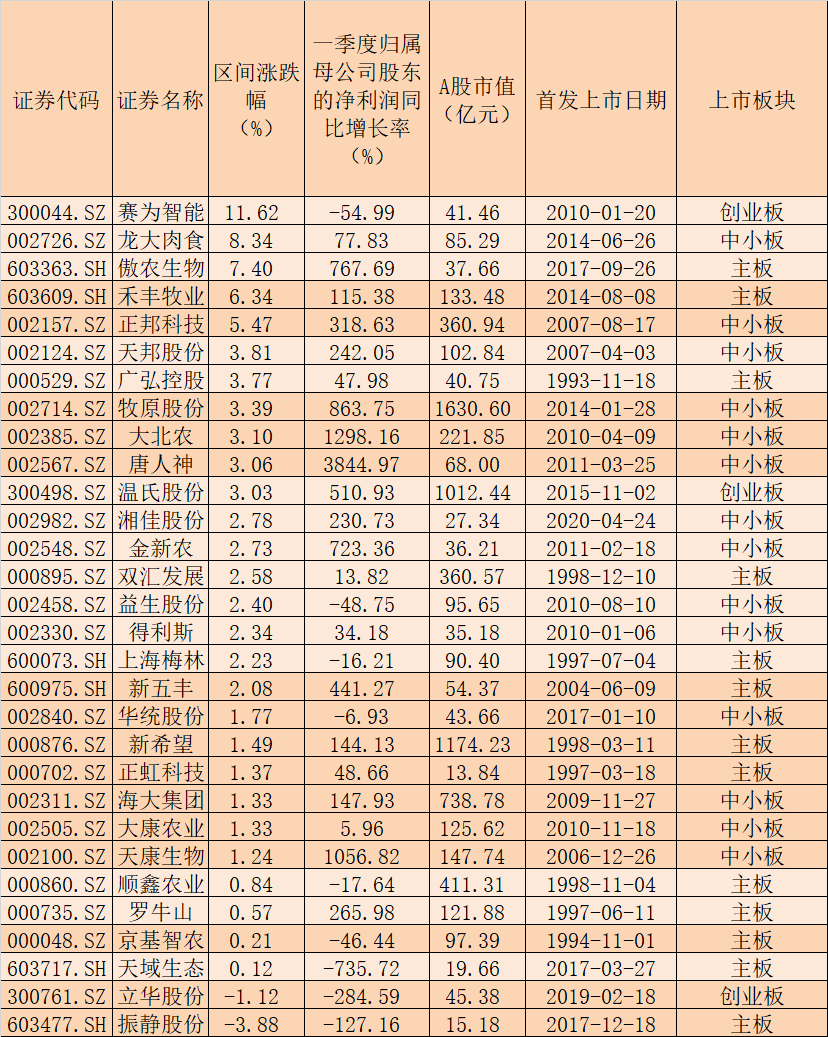 具體來看,賽為智能、龍大肉食、傲農(nóng)生物、禾豐牧業(yè)、正邦科技等5只概念股期間累計漲幅逾5%,天邦股份、廣弘控股、牧原股份、大北農(nóng)、唐人神、溫氏股份、湘佳股份、金新農(nóng)、雙匯發(fā)展、益生股份、得利斯、上海梅林、新五豐等個股期間累計上漲2%以上。