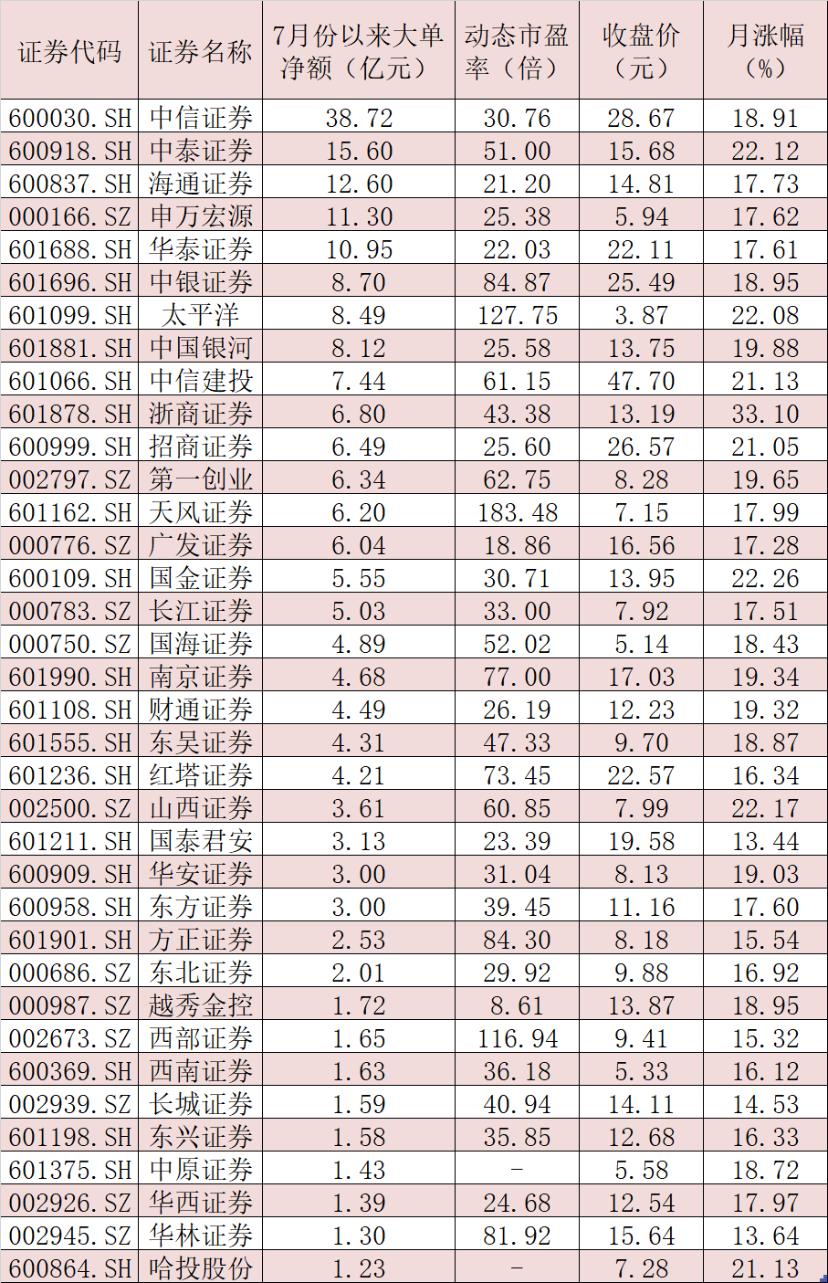 表:月內實現(xiàn)大單資金凈流入超過1億元的券商股