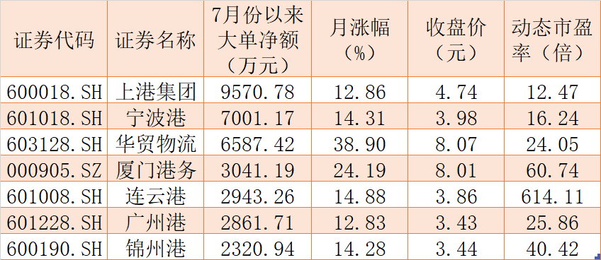 資金流向上,7月份以來,板塊內共有13只概念股呈現大單資金凈流入態(tài)勢,上港集團期間累計大單資金凈流入居首,達到9570.78萬元,寧波港(7001.17萬元)、華貿物流(6587.42萬元)、廈門港務(3041.19萬元)、連云港(2943.26萬元)、廣州港(2861.71萬元)和錦州港(2320.94萬元)等6只概念股當日均受到2000萬元以上大單資金追捧,這7只概念股合計吸金3.43億元。