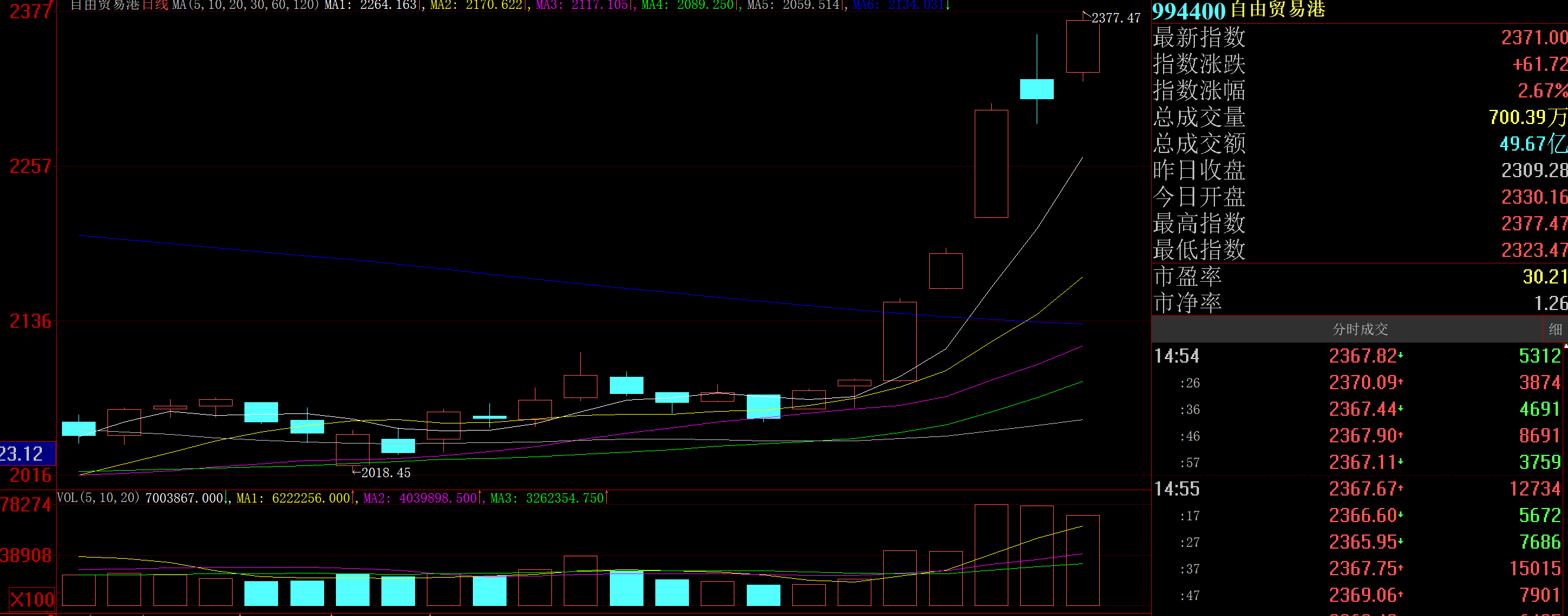 “自由貿易港板塊迎來政策利好,現在股市逐步走向全面牛市,所以各個板塊都有表現的機會,而該板塊是新時代改革開放的新高地,未來建設自由貿易港也會帶來較大的投資機會,相關配置機會顯現。自由貿易港通過制度創(chuàng)新,可能會形成比較好的改革紅利,從而給當地的上市公司帶來一定的機會。”前海開源基金首席經濟學家楊德龍對《證券日報》記者表示。