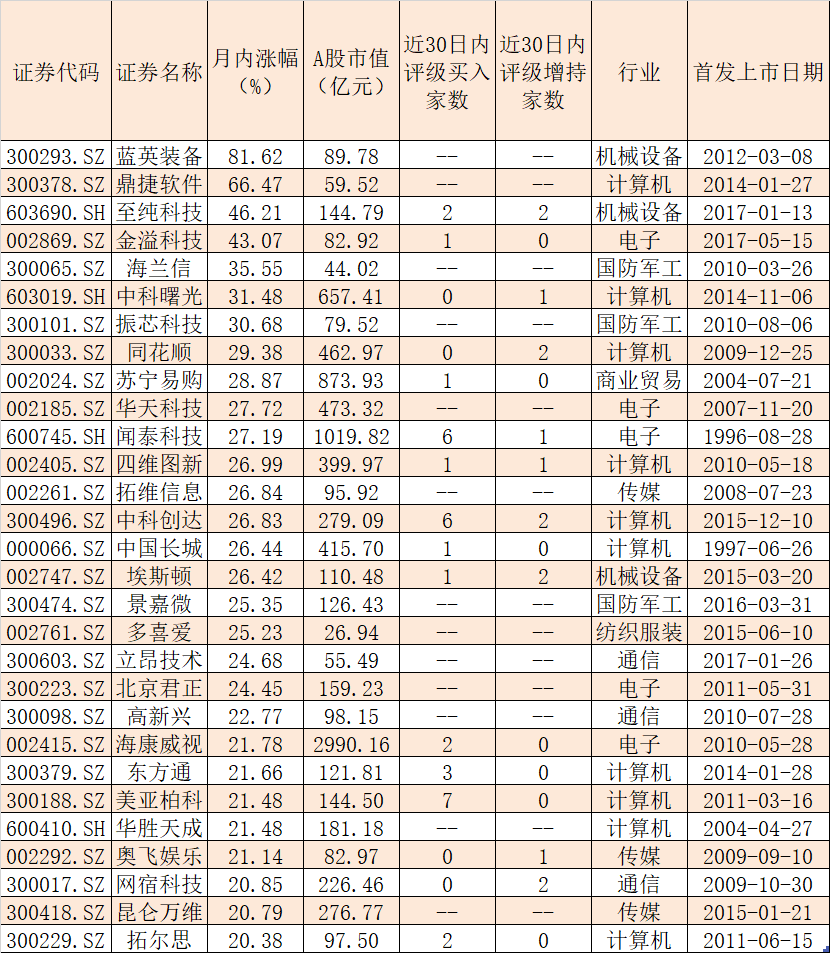 表:部分人工智能股月內(nèi)市場表現(xiàn)