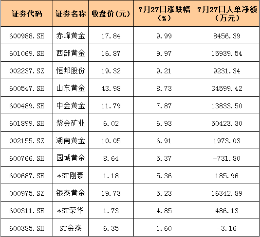 可以看到,一路走高的金價(jià)也帶動(dòng)了黃金股的大面積活躍。對(duì)于做多黃金股的資金來(lái)說(shuō),目前市場(chǎng)中的相關(guān)概念股相對(duì)于黃金資產(chǎn)本身來(lái)說(shuō),有低位補(bǔ)漲的需求。在7月27日國(guó)際金價(jià)創(chuàng)出歷史新高之際,15.07億元大單涌入黃金板塊,資金的大幅流入助力12只黃金股全線走強(qiáng),截至收盤(pán)漲幅均在1%以上,赤峰黃金、西部黃金、*ST剛泰、*ST榮華等4只個(gè)股強(qiáng)勢(shì)漲停。