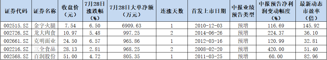 資金流向方面,7月28日,上述5只個(gè)股均實(shí)現(xiàn)大單資金凈流入,金字火腿大單資金凈流入居首達(dá)到6909.63萬(wàn)元。