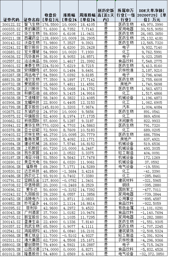 從資金流向來看,統(tǒng)計發(fā)現(xiàn),7月29日,在上述51只個股中,有31只個股呈現(xiàn)大單資金凈流入狀態(tài),占比逾六成。其中,智飛生物、美的集團、華蘭生物、西藏藥業(yè)、沃森生物