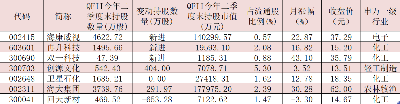 表:今年二季度獲QFII持倉(cāng)的個(gè)股一覽