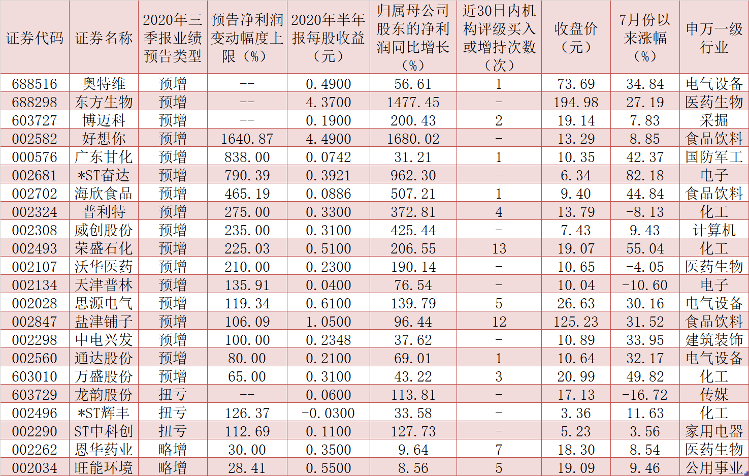 可以看到,好想你、*ST奮達(dá)、海欣食品、威創(chuàng)股份、普利特、榮盛石化、沃華醫(yī)藥、思源電氣等8家公司有望實(shí)現(xiàn)上半年和三季度凈利潤(rùn)同比翻番,高成長(zhǎng)性較為顯著。