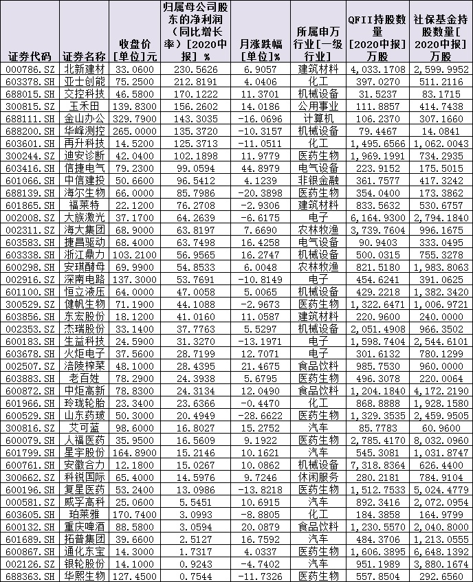 秉承長(zhǎng)期投資、價(jià)值投資理念的社保基金持倉(cāng)一直以來(lái)備受各方關(guān)注。在上述1110家凈利潤(rùn)增長(zhǎng)的公司中,截至今年上半年,包括順絡(luò)電子、湯臣倍健、利爾化學(xué)、廈門(mén)象嶼等在內(nèi)的197家公司的前十大流通股股東名單中有社?;瓞F(xiàn)身。另外,有106公司的前十大流通股股東名單中有QFII現(xiàn)身。進(jìn)一步梳理發(fā)現(xiàn),有43家公司同時(shí)被社?;鸷蚎FII持有,成為兩大機(jī)構(gòu)共同追捧的對(duì)象。