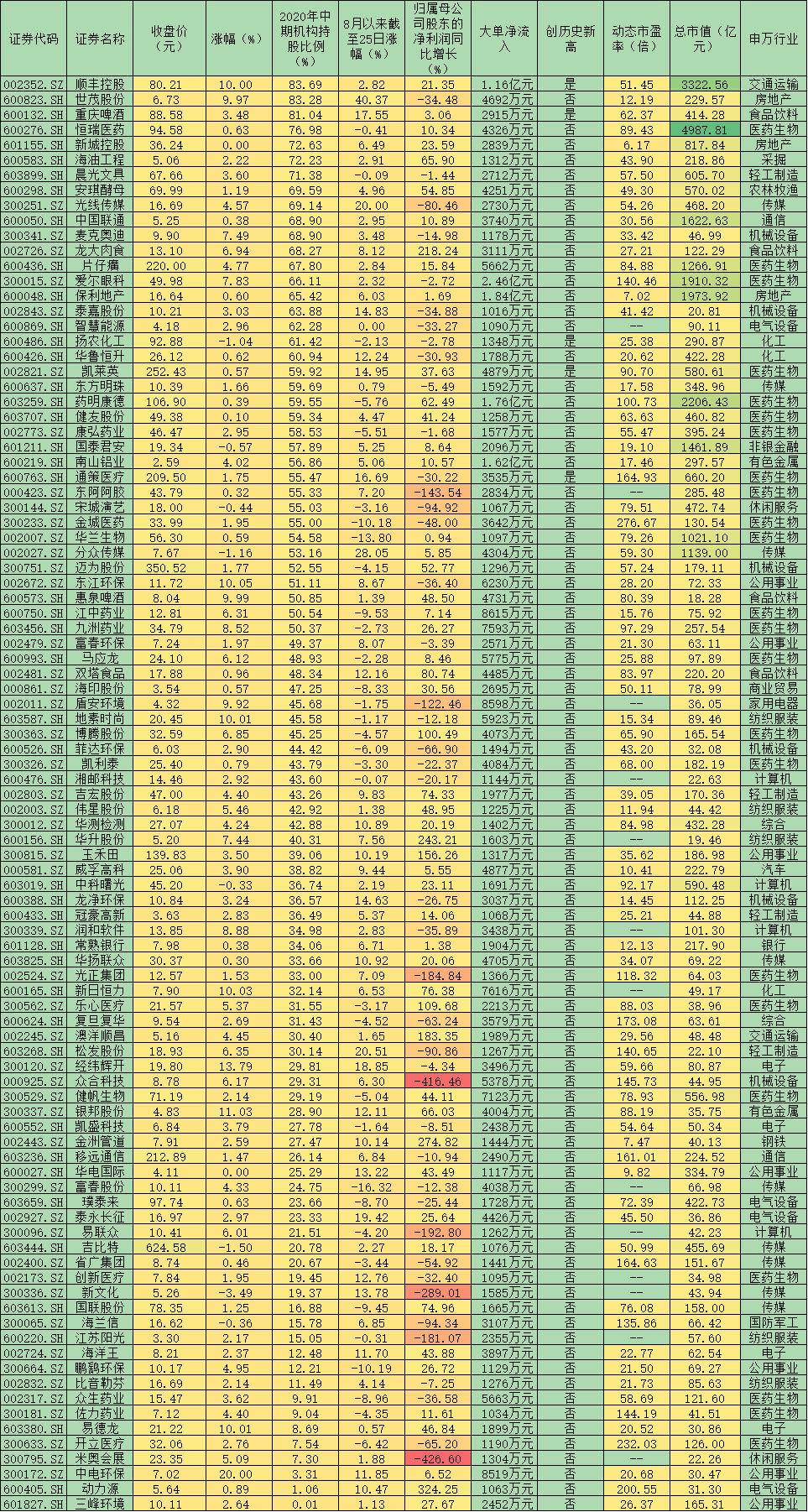 表:周三超1000萬元大單資金凈買入個股2020年中期機構(gòu)持股比例一覽