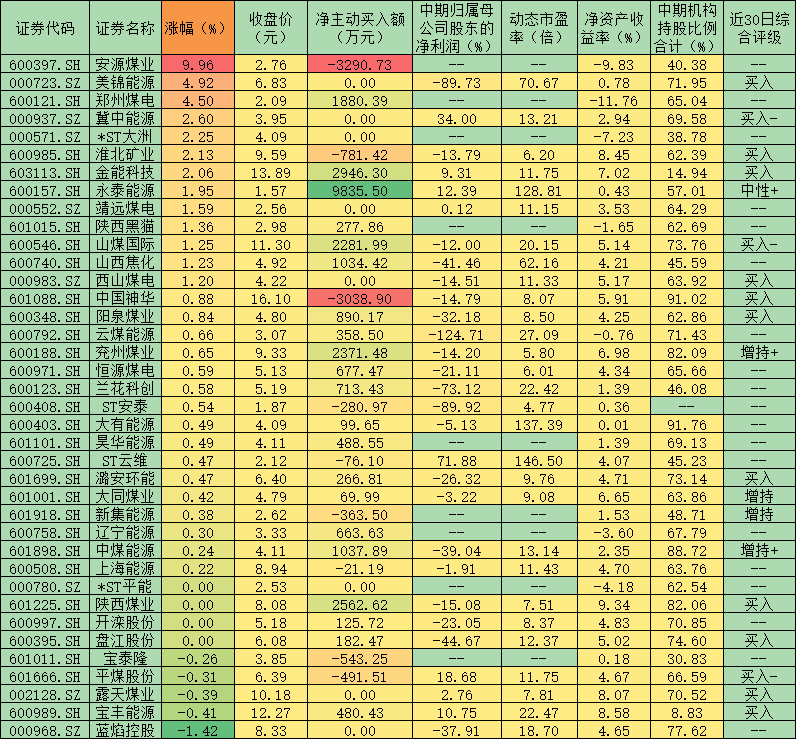 從具體市場表現來看,周四,38只交易中的煤炭采選股有29只實現上漲,其中,安源煤業(yè)漲停報收,另有包括美錦能源(4.92%)、鄭州煤電(4.50%)、冀中能源(2.60%)等在內的7只個股漲幅超2%。