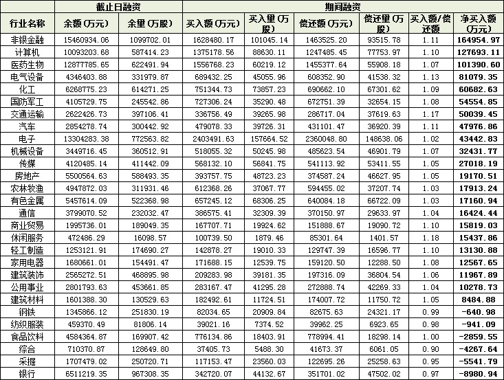 從行業(yè)方面看,9月份以來(lái),在申萬(wàn)一級(jí)的28個(gè)行業(yè)中,有22個(gè)行業(yè)被融資客凈買(mǎi)入,其中,非銀金融、計(jì)算機(jī)、醫(yī)藥生物等三大行業(yè)期間凈買(mǎi)入額均超10億元,分別為16.5億元、12.8億元和10.14億元,合計(jì)達(dá)39.44億元。緊隨其后的是電氣設(shè)備、化工、國(guó)防軍工和交通運(yùn)輸?shù)人男袠I(yè),期間融資凈買(mǎi)入額均超5億元。