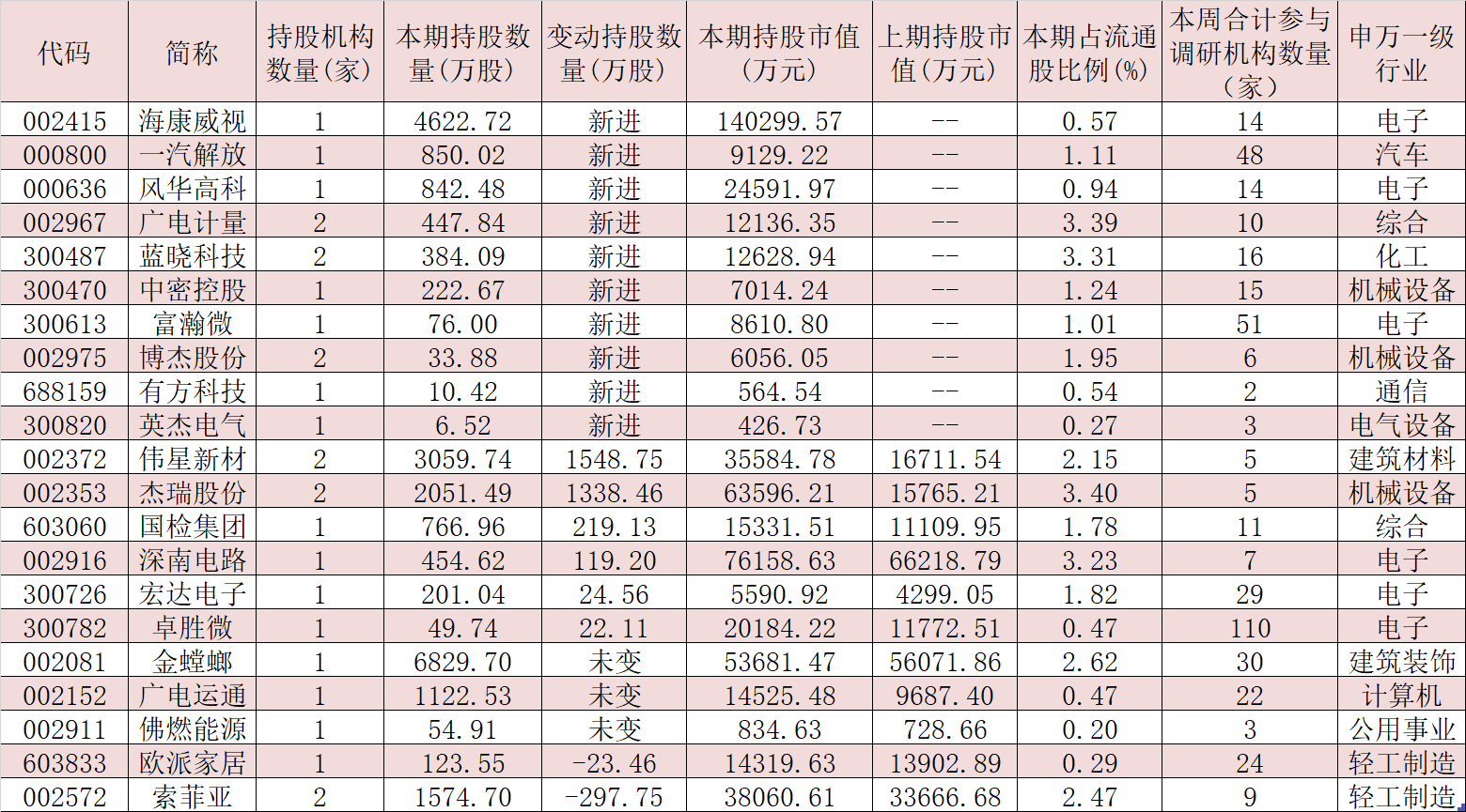可以看到,以QFII為代表的外資也提前布局了近期機(jī)構(gòu)調(diào)研標(biāo)的。統(tǒng)計(jì)顯示,上述189只個(gè)股中,截至今年二季度末,共有21只個(gè)股獲得QFII持倉(cāng),合計(jì)持股市值為31.94億元。其中,16只個(gè)股成為今年二季度QFII新進(jìn)增持的重點(diǎn)品種,QFII新進(jìn)持有??低?、一汽解放、風(fēng)華高科、廣電計(jì)量、藍(lán)曉科技、中密控股、富瀚微、博杰股份、有方科技、英杰電氣等10只個(gè)股,并對(duì)偉星新材、杰瑞股份、國(guó)檢集團(tuán)、深南電路、宏達(dá)電子、卓勝微等6只個(gè)股進(jìn)行繼續(xù)加倉(cāng)操作,這16只個(gè)股QFII合計(jì)增持資金達(dá)31.49億元。