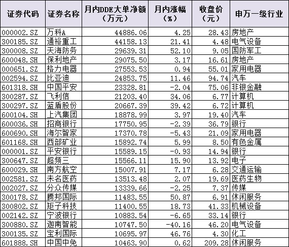在多數(shù)行業(yè)呈現(xiàn)出資金凈流出的情況下,依然有部分個股受到市場資金的追捧。統(tǒng)計(jì)發(fā)現(xiàn),9月以來的5個交易日中,有1088只個股呈現(xiàn)資金凈流入態(tài)勢,占可交易的全部A股的27.9%。其中,資金凈流入超1000萬元的個股達(dá)278只,包括萬科A、通裕重工、天海防務(wù)、保利地產(chǎn)、格力電器、比亞迪、中國平安、飛利信、藍(lán)盾股份等在內(nèi)的24只個股,期間資金凈流入均超1億元,合計(jì)達(dá)47.4億元。