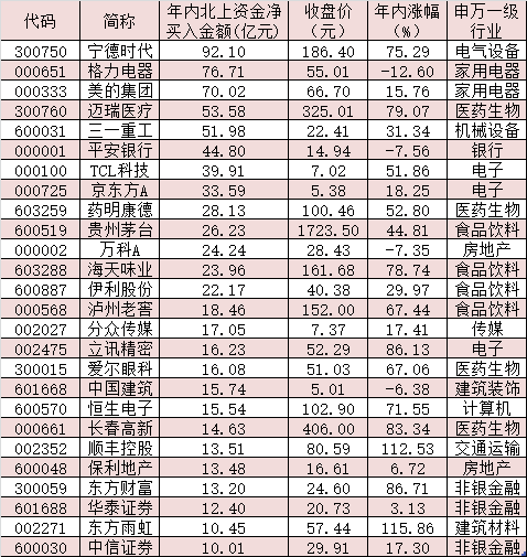表:今年以來(lái)北上資金凈買(mǎi)入額超過(guò)10億元的個(gè)股
