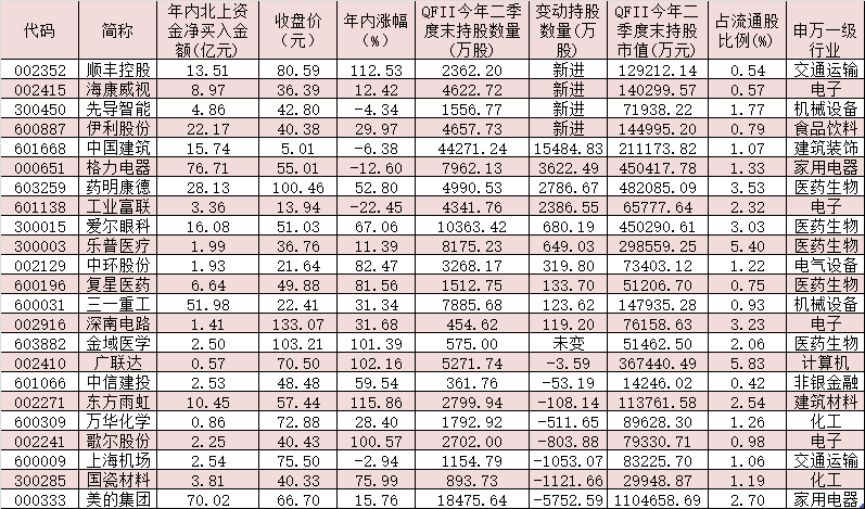 表:今年二季度獲QFII持倉(cāng)且今年以來(lái)受北上資金青睞的個(gè)股