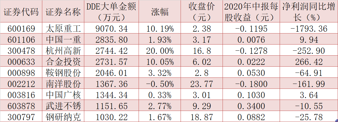 最后,各路資金開始布局。記者進(jìn)一步統(tǒng)計(jì)發(fā)現(xiàn),9月9日,板塊內(nèi)共有26只概念股呈現(xiàn)大單資金凈流入態(tài)勢(shì)。其中,太原重工大單資金凈流入居首,達(dá)到9070.34萬元,中國一重、杭州高新、合金投資、鞍鋼股份、南洋股份、中國廣核、武進(jìn)不銹、鋼研納克等8只概念股大單資金凈流入也均在千萬元以上,這9只概念股合計(jì)吸金2.43億元。