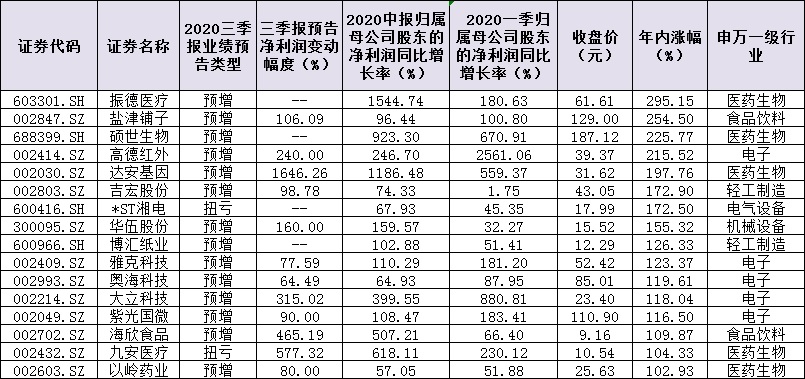 在上述117只業(yè)績(jī)?nèi)B增的個(gè)股中,從三季報(bào)業(yè)績(jī)來看,有57家公司凈利潤(rùn)同比有望翻番。其中,圣湘生物、達(dá)安基因、星網(wǎng)宇達(dá)能等3家公司預(yù)計(jì)三季報(bào)凈利潤(rùn)增幅上限均在10倍以上,分別為9224.12%、1646.26%和1373.25%。緊隨其后的是三泰控股、*ST奮達(dá)、新五豐、九安醫(yī)療、寧波聯(lián)合、天賜材料等6家公司,凈利潤(rùn)同比增幅均有望超500%。