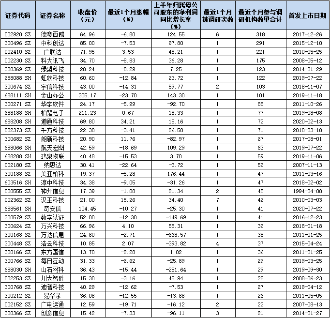 表:最近1個參與調(diào)研機(jī)構(gòu)在20家以上的計算機(jī)公司一覽