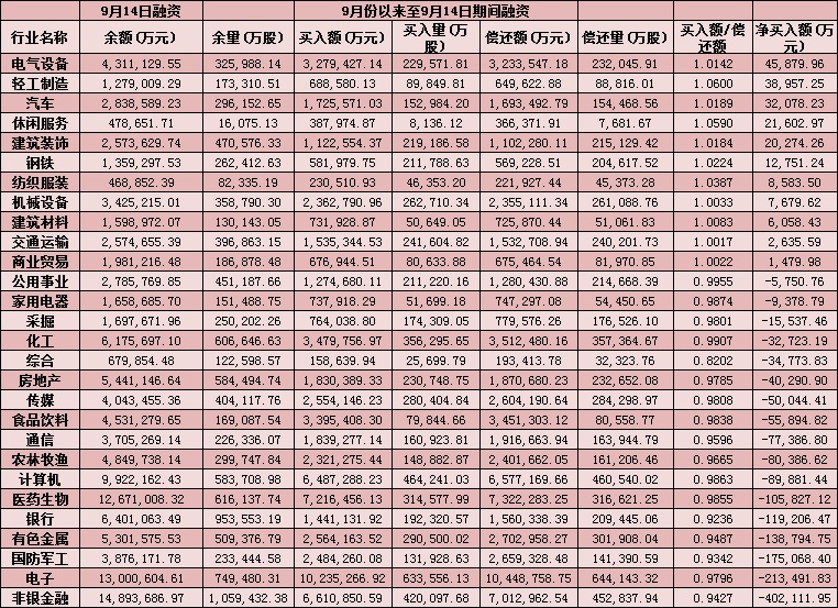 表:9月份以來截至9月14日28個(gè)申萬(wàn)一級(jí)行業(yè)融資情況