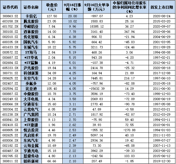 表:9月16日漲幅超2%的新能源車概念股一覽