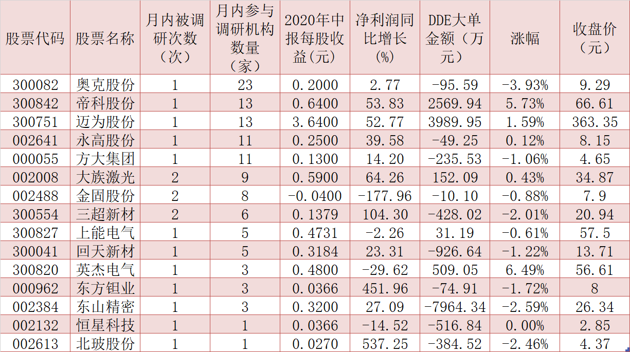 在業(yè)績逐步改善的環(huán)境下,近期機構(gòu)對光伏公司調(diào)研熱情高漲,9月份以來共有15家相關(guān)上市公司獲機構(gòu)密集調(diào)研,奧克股份、帝科股份、邁為股份、永高股份、方大集團等5家公司月內(nèi)均受到10家及以上機構(gòu)扎堆調(diào)研,包括大族激光、金固股份、三超新材等在內(nèi)的10家公司也被機構(gòu)走訪調(diào)研。
