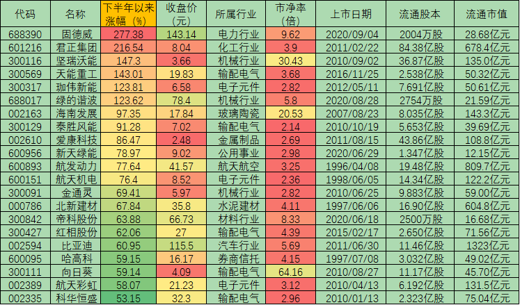 表:下半年以來新能源板塊漲幅超50%個(gè)股市場表現(xiàn)一覽