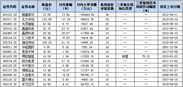 表:機(jī)構(gòu)看好評(píng)級(jí)家數(shù)在10家及以上的光伏概念股一覽