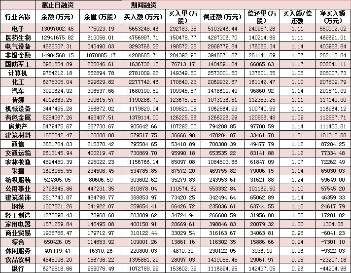 另外,非銀金融、國防軍工、計算機、化工、汽車等行業(yè)融資凈買入額也均在20億元以上。僅有銀行、食品飲料、休閑服務、綜合和商業(yè)貿(mào)易等五行業(yè)被融資客減持。